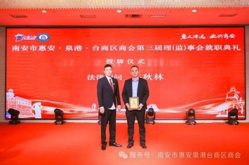 ▲南安市惠安商会监事长李靖彬为法律顾问许秋林授牌