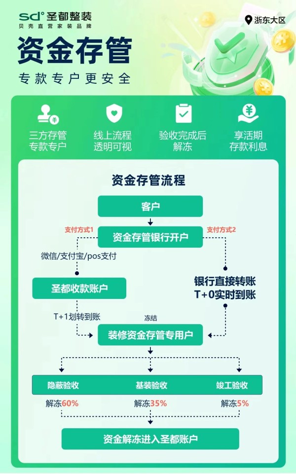 为破解“预付费”模式下的消费信任难题,圣都整装率先在行业内大范围推行与中信银行合作的 “资金存管”服务,将装修款项置于银行第三方监管之下,严格按施工节点验收拨付,让消费主动权回归业主。