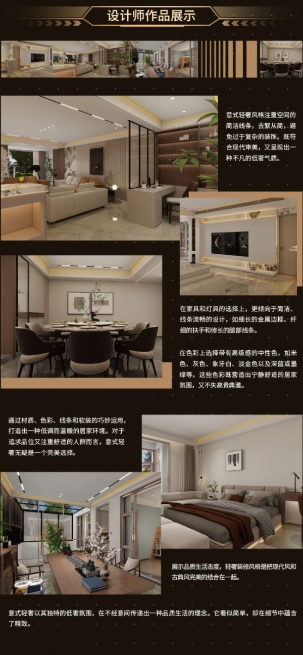 另外,出自设计师陈伯彪之手的意式轻奢大平层,则在开阔通透的格局中,蕴藏了精心规划的流动节奏与层次韵律:通过简洁流畅的线条设计,去繁从简,把现代风与古典风完美结合,营造出低调奢华的视觉感受;同时,巧妙运用材质、色彩和软装,打造出温暖而有质感的居家环境,为居住者营造出一方从容安定、可滋养身心的场域,彰显出归真生活的设计理念。
