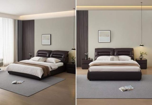 38cm加厚沙发级宽大软靠,给予身体温柔承托,左右分区互不打扰。双层结构设计,柔软层软包内填生态鹅毛与微孔式高弹棉,丰盈饱满,放松腰背;支撑层头枕与屏架填充海绵,呵护颈椎,提升倚靠舒适度。1.3mm加厚头层牛皮,荔枝皮纹细腻柔韧,久用如新,带来奢感体验。高承重碳钢床架搭配多层实木排骨片,承重优越,整夜安睡静音无忧。