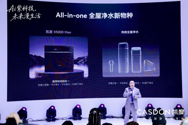 凯度X5000 Mee全屋集成净水中心进化版,以一台产品实现传统全屋净水四台机器(前置过滤、中央净水、中央软水、RO厨下净水)的全部功能,并且突破高强度集成行业技术壁垒,仅占地0.18立方米,告别传统全屋净水需要设备间的痛点,支持一站式智适应滤芯管理、智慧自动冲洗等功能,全方位覆盖生活净水、洗护软水、直饮纯水需求。
