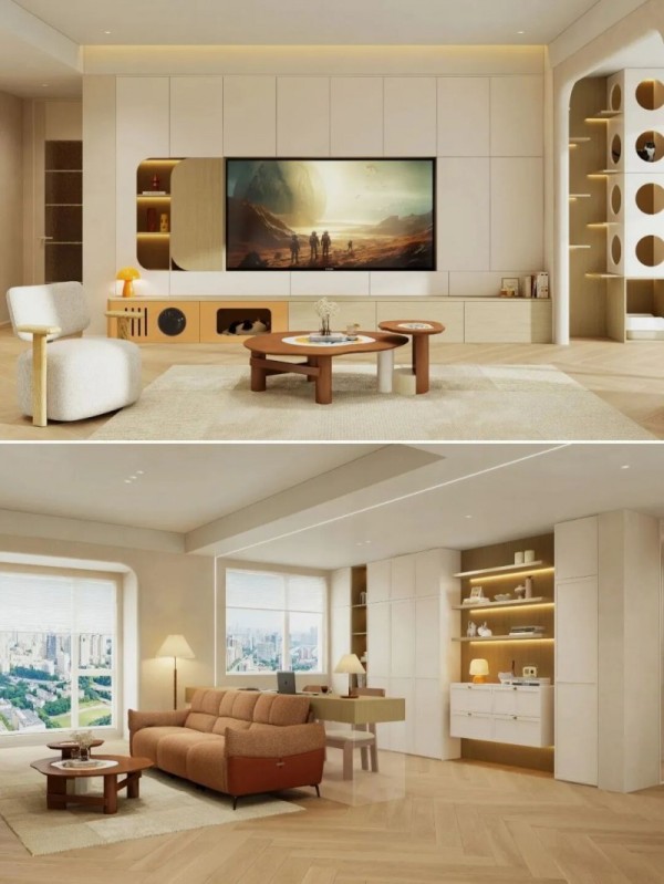 软乎乎的治愈系选手。整体以奶白、奶杏为主色调,没有尖锐的棱角,家具都自带温柔滤镜。仿佛被温柔包裹,所有的疲惫和寒意都能瞬间消散。