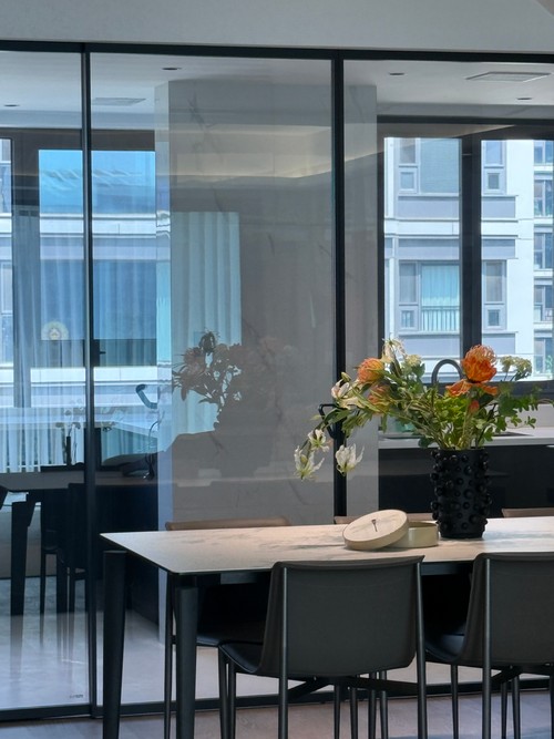 李娜: 这套作品是太泽之星205㎡大平层。原户型采光优越,但厨房为U型布局,空间略显局促。在与业主充分沟通后,我们对空间进行了开放式优化,将U型厨房改造为开放式格局,与餐厅融为一体,极大拓展了客餐厅的整体尺度与通透感。设计上以合理规划、优化布局为核心,整体采用简约大气的黑白灰基调,再通过局部点缀亮色,增添空间的灵动与活泼感,让黑白灰做到极致而不沉闷,打造出通透、舒适、有温度的现代居所。