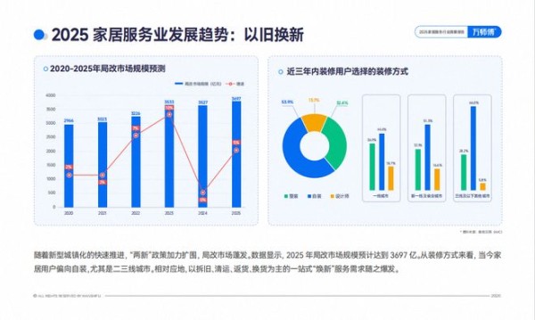 调研结果显示,2025年局改市场规模预计达到3697亿,超半数居民偏向自装。这意味着,家居企业需要从“卖产品”转向“卖解决方案”。