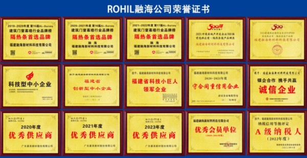 生产基地通过ISO质量、环境及职业健康安全管理体系认证,荣获“碳中和承诺示范单位”、“绿链行动绿名单企业”。公司参与起草多项隔热条行业标准,旗下“融海(ROHIL)”品牌连续八年荣登行业品牌榜“隔热条首选品牌”、“民族品牌国货匠心工程”认证,被评定为“隔热条行业领航品牌”、跻身国产品牌前五强,稳居中国家装门窗隔热条一线品牌地位。