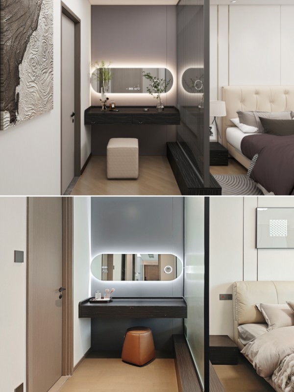 睡眠区和梳妆区采用玻璃隔断,相对独立又不影响整体性。梳妆区定制悬浮式台面,搭配椭圆妆镜,高级感满满。