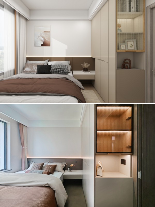护墙板搭配无床头设计,节约空间。衣柜与床头柜一体化,整体性强。侧边柜搭配金丝玻璃柜门,视觉灵动,氛围感直接拿捏。